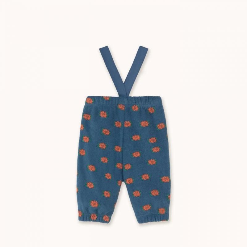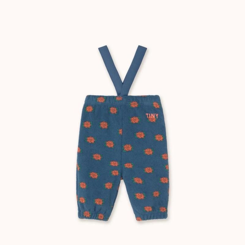 レトロなバラ柄とパイル生地を使用した、サスペンダーつきパンツ。